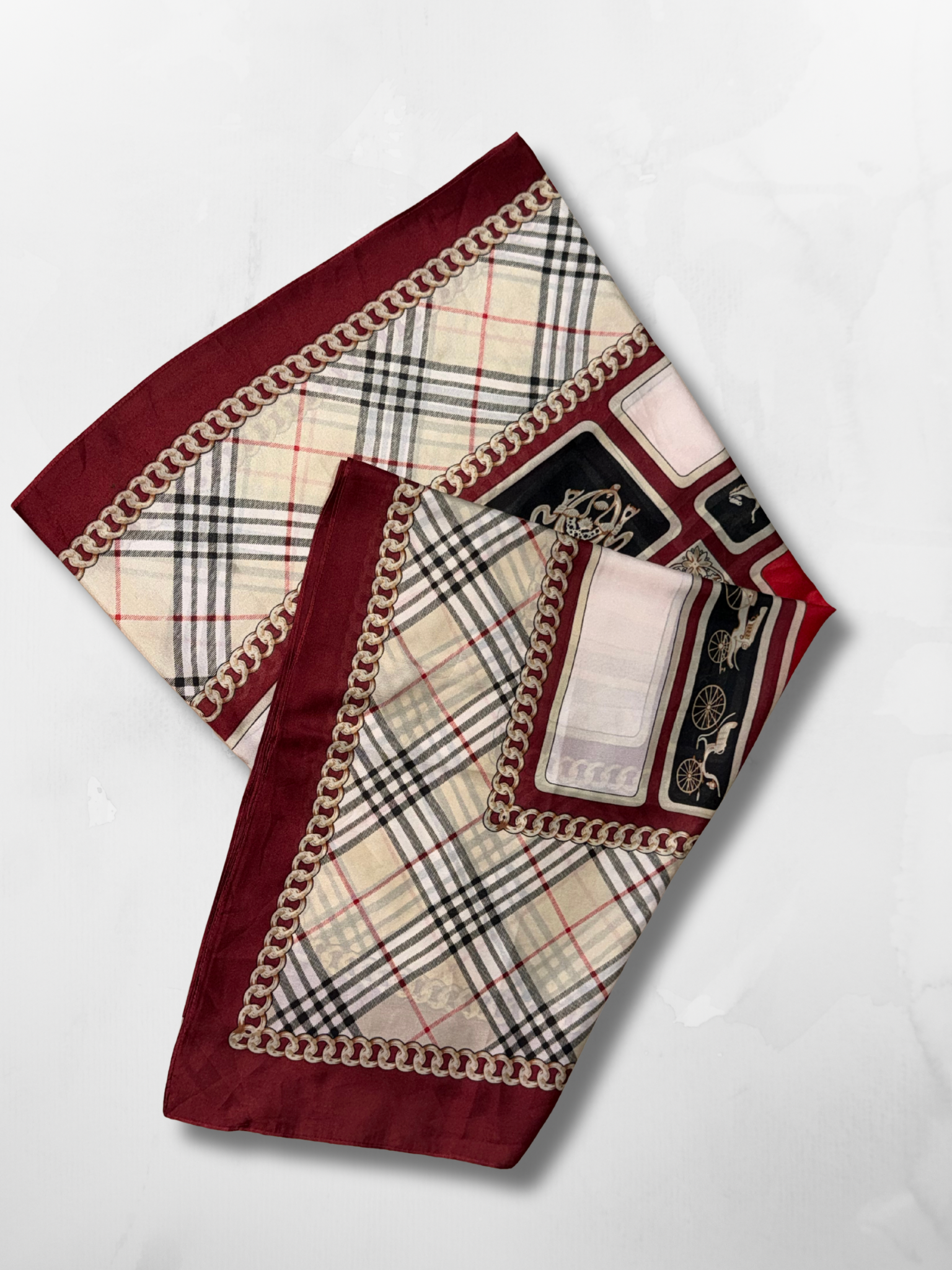 - Design: The scarf combines the iconic Burberry Check with a detailed chain-link border and a historical Horseferry or Equestrian Knight Design carriage emblem.